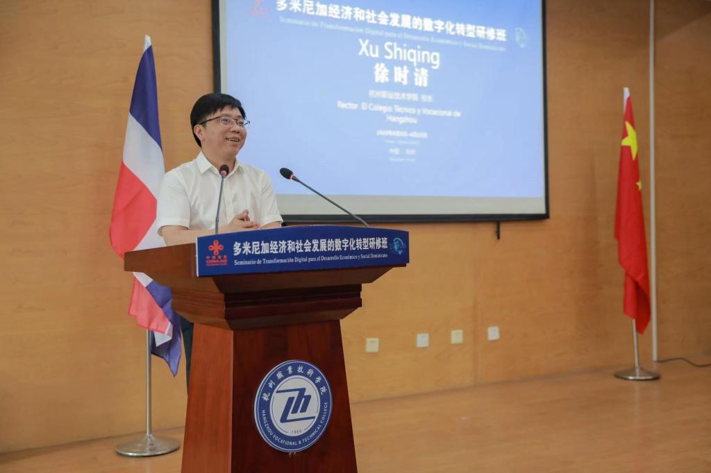 校长徐时清介绍了杭职院的基本情况,重点介绍了学校国际化发展和援外培训工作的发展历程。他表示,杭职院将充分发挥高职教育优势办好本次研修班。他希望各位官员学习了解中国的数字化转型相关经验,学有所获,也希望此次研修班能成为中国与多米尼加沟通交流的桥梁纽带。