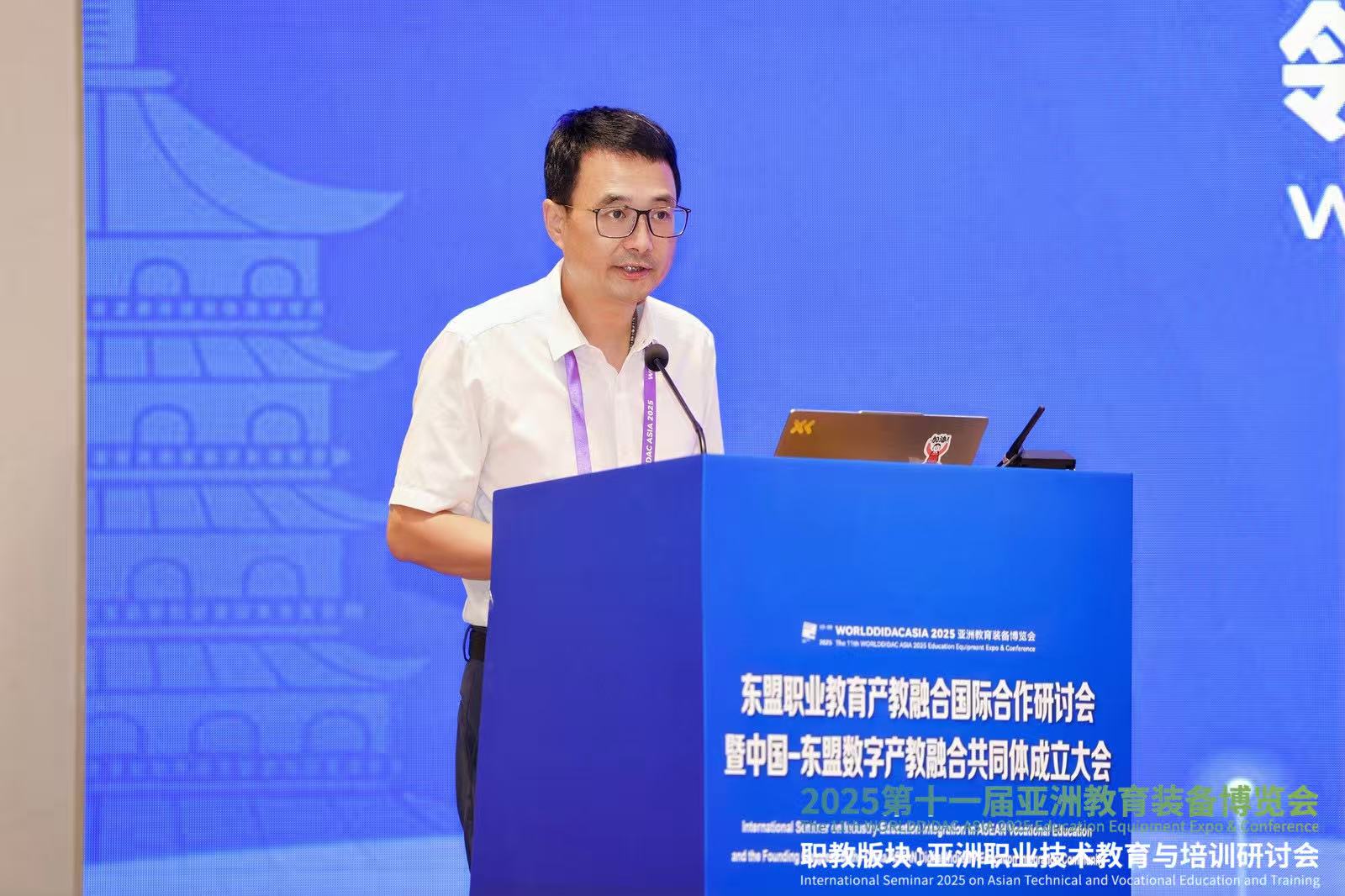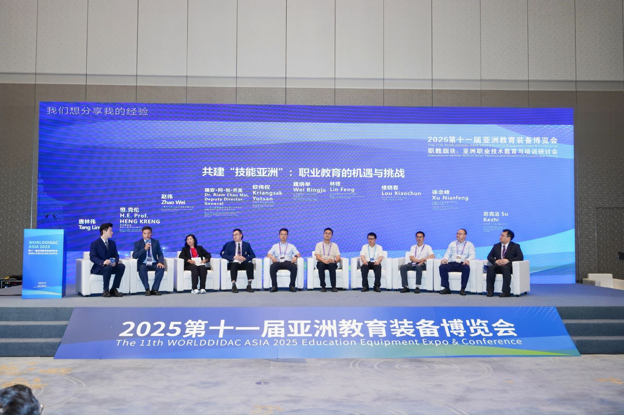 第十一届亚洲教育装备博览会(WORLDDIDAC ASIA 2025)于2025 年9月17日至19日在杭州大会展中心正式举办。作为本届博览会的重要组成部分,由全国高等职业学校校长联席会议、宁波市职业技术教育学会主办,我校协办的职教板块主论坛——“亚洲职业技术教育与培训研讨会”同期开展。本次研讨会吸引了来自15个国家的政府机构、院校及企业代表共300余人参会,为亚洲职业教育领域搭建了高效的交流平台。我校副校长楼晓春受邀出席该主论坛,并参与多场重要交流活动。
